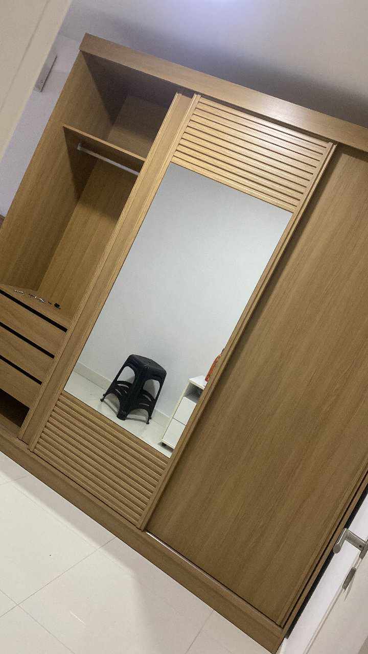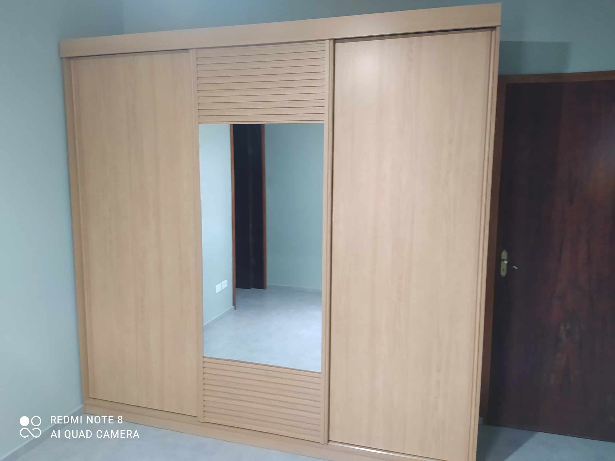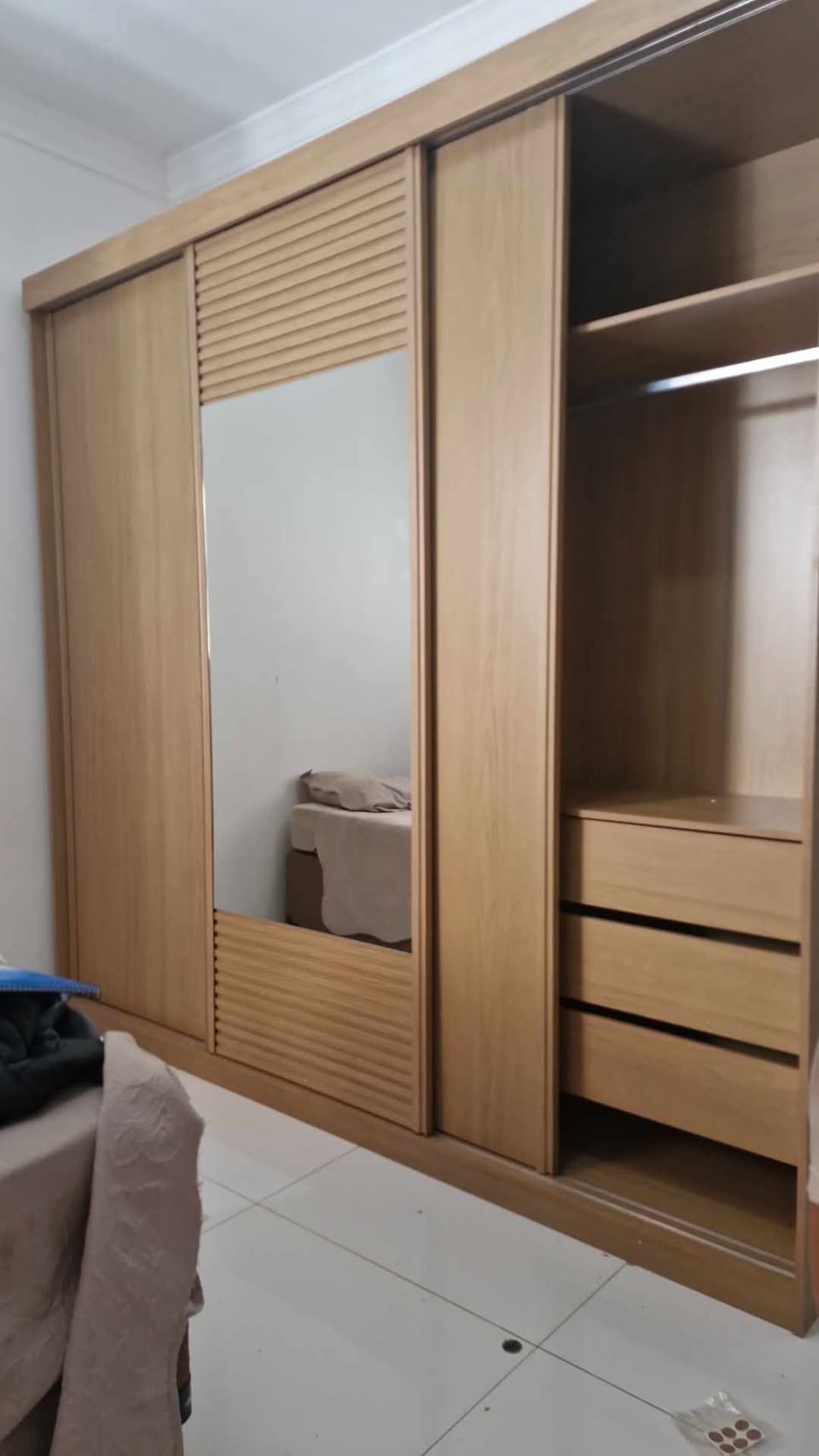 واجهة الدولاب تتميّز بباب أوسط يحتوي على مرآة بطول كامل، تضيف لمسة عملية وأناقة بصرية، مع بابين جانبيين بلون بيچ ناعم بتشطيب سادة. المرآة تعزز من الإحساس بالمساحة وتضفي عمقًا بصريًا على الغرفة.