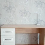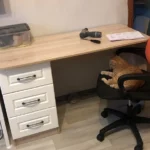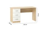 مكتب عملي – عرض 130 سم، عمق 60 سم، ارتفاع 75 سم – 3 أدراج جانبية، تصميم أنيق بلون خشبي وأبيض، مصنوع من خشب كونتر طبيعي، بضمان 10 سنوات.