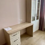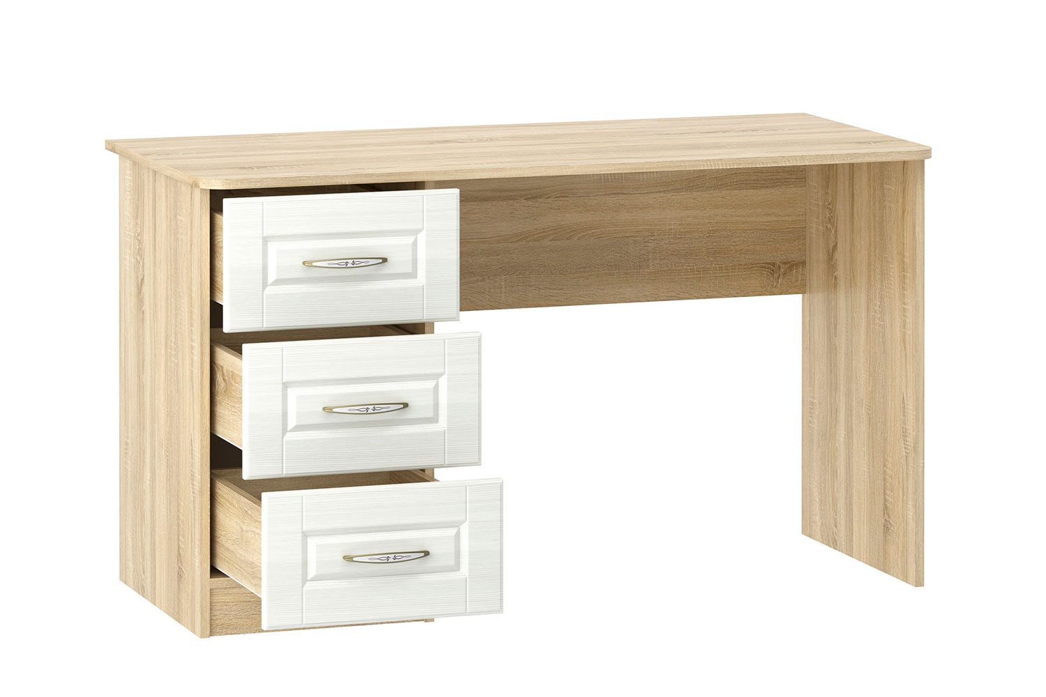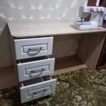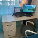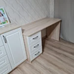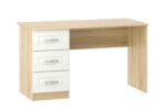 مكتب بتصميم عملي وأنيق، مناسب للاستخدام المنزلي أو المكتبي. يتميز بسطح واسع وهيكل بلون خشبي فاتح، مع ثلاثة أدراج جانبية بواجهات بيضاء ومقابض معدنية، يوفر مساحة تخزين منظمة وسطح مريح للعمل أو الدراسة.