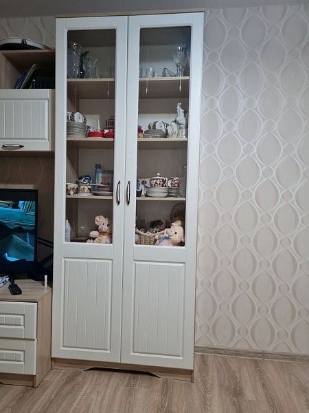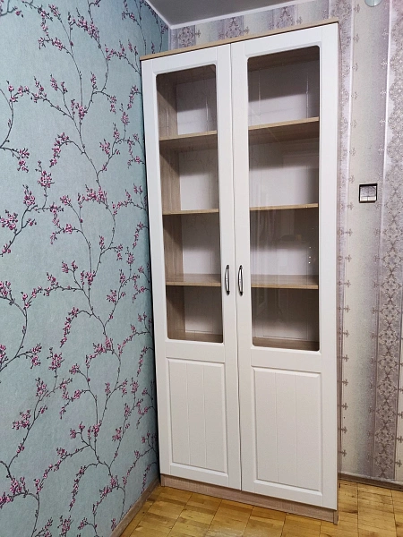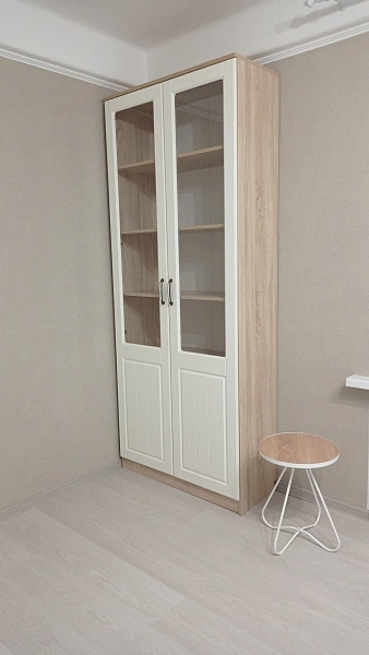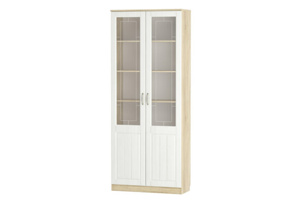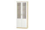 وحدة عرض رأسيّة بتصميم أنيق وعصري، مناسبة لغرف المعيشة أو المكاتب أو غرف النوم. تحتوي على أبواب مزدوجة بواجهات زجاجية علوية تسمح بعرض المحتويات، مع رفوف داخلية متعددة للتنظيم. الهيكل بلون خشبي فاتح، والأبواب بيضاء مزودة بزجاج مزخرف ومقابض معدنية.