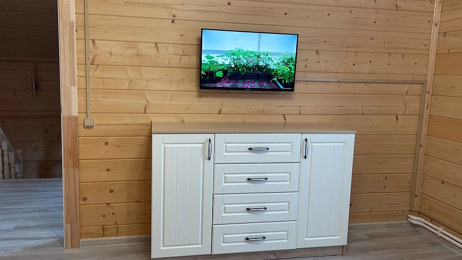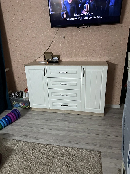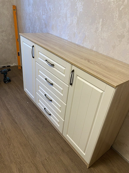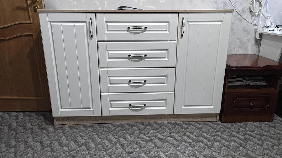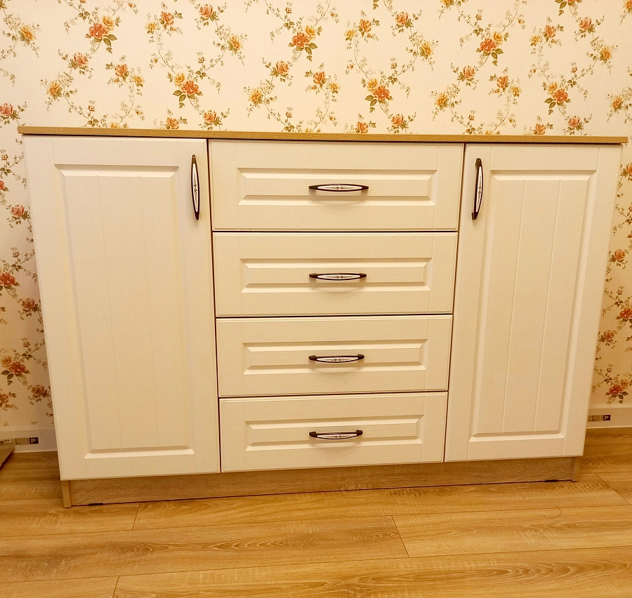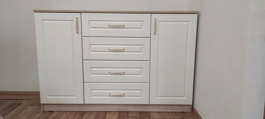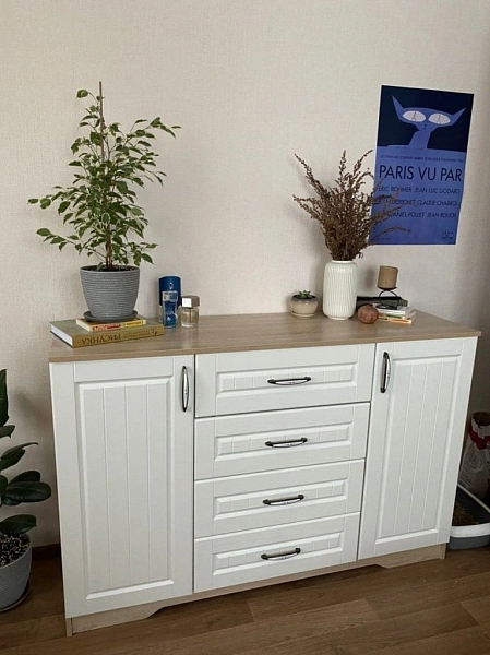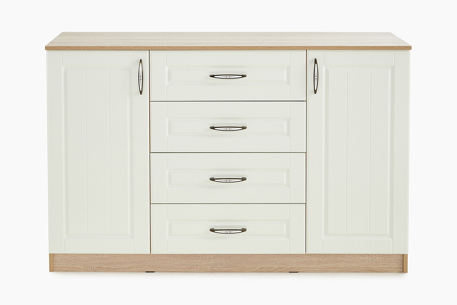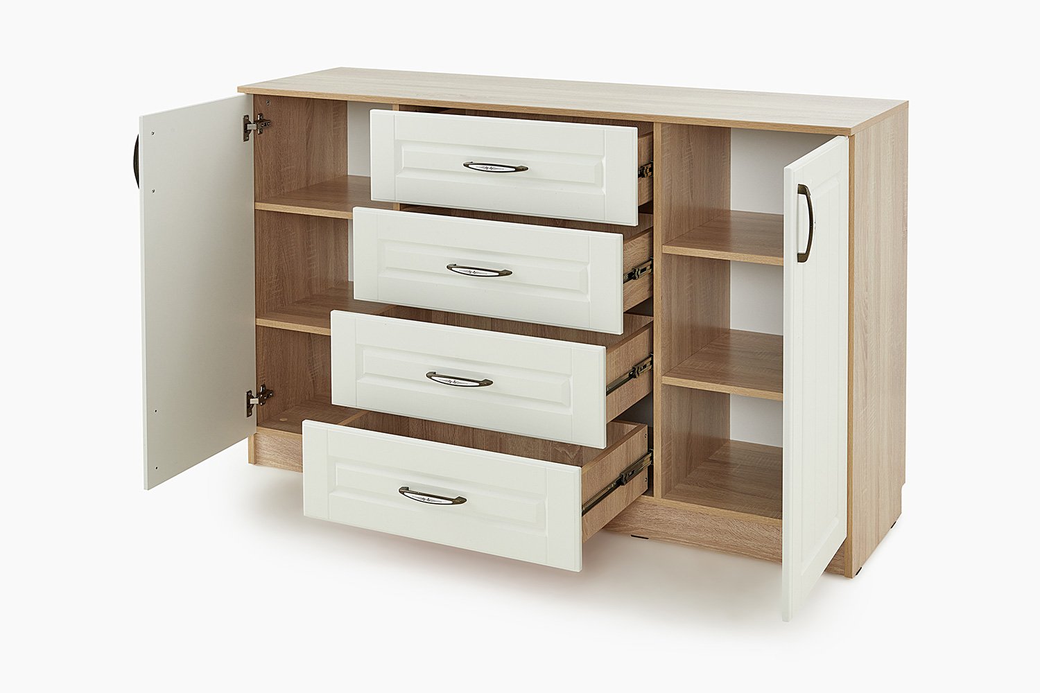 وحدة تخزين 4 أدراج + بابين جانبيين – عرض 140.2 سم، عمق 42 سم، ارتفاع 92.8 سم – تصميم عملي بلون خشبي وأبيض، مصنوعة من خشب كونتر طبيعي، بضمان 10 سنوات.