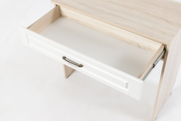 تسريحة جانبية بتصميم بسيط وعملي، مناسبة لغرف النوم أو المساحات الصغيرة. تتميز بسطح مريح للاستخدام اليومي، وهيكل بلون خشبي فاتح، مع درج أمامي بواجهة بيضاء ومقبض معدني، توفر مساحة خفيفة لتخزين أدوات الزينة أو المتعلقات الشخصية.