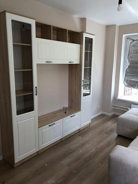 وحدة تلفزيون متكاملة – عرض 211 سم، ارتفاع 220 سم، عمق 57 سم – خزائن جانبية، قاعدة تلفزيون 120 سم، رف علوي 120 سم، تصميم أنيق بخشب كونتر طبيعي عالي الجودة، بضمان 10 سنوات.
