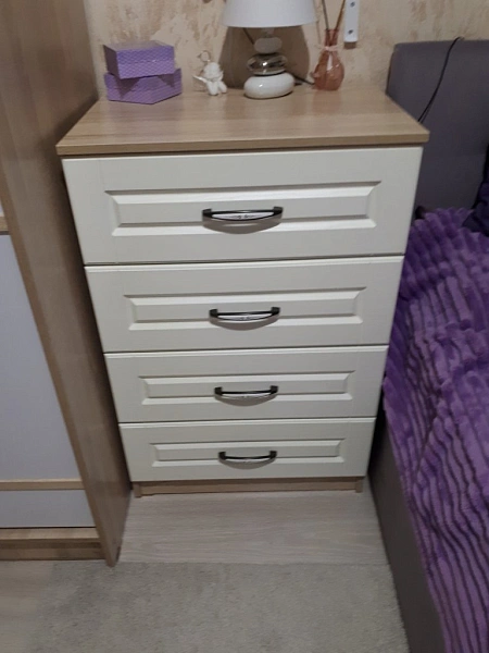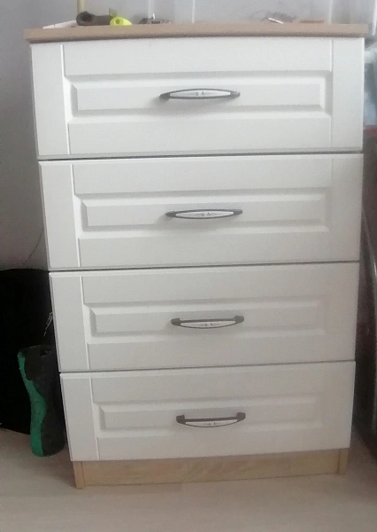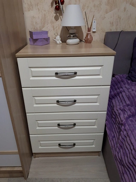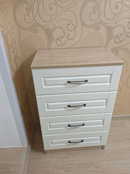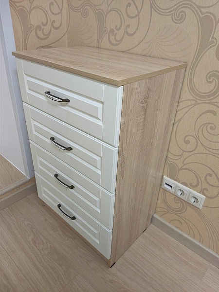 وحدة أدراج بتصميم عملي وأنيق، مناسبة للاستخدام في غرف النوم أو المساحات المكتبية. تتكون من أربعة أدراج بواجهات بيضاء مزودة بمقابض معدنية، وهيكل بلون خشبي فاتح، مما يوفر مزيجًا متوازنًا بين الوظيفة والشكل.