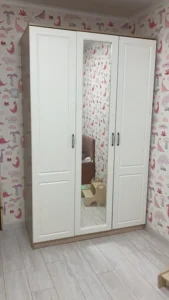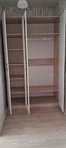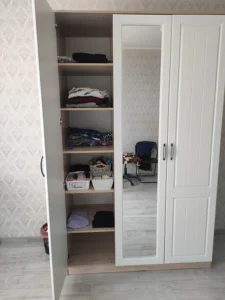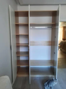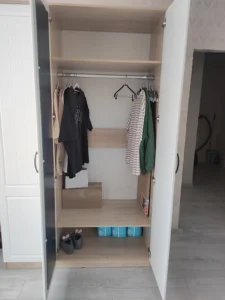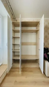 دولاب ملابس بـ3 ضلف مفصلات+ تقسيمة عملية تشمل تعليق ورفوف – مقاس 120×56×220 سم – خشب كونتر طبيعي – بضمان 10 سنوات.