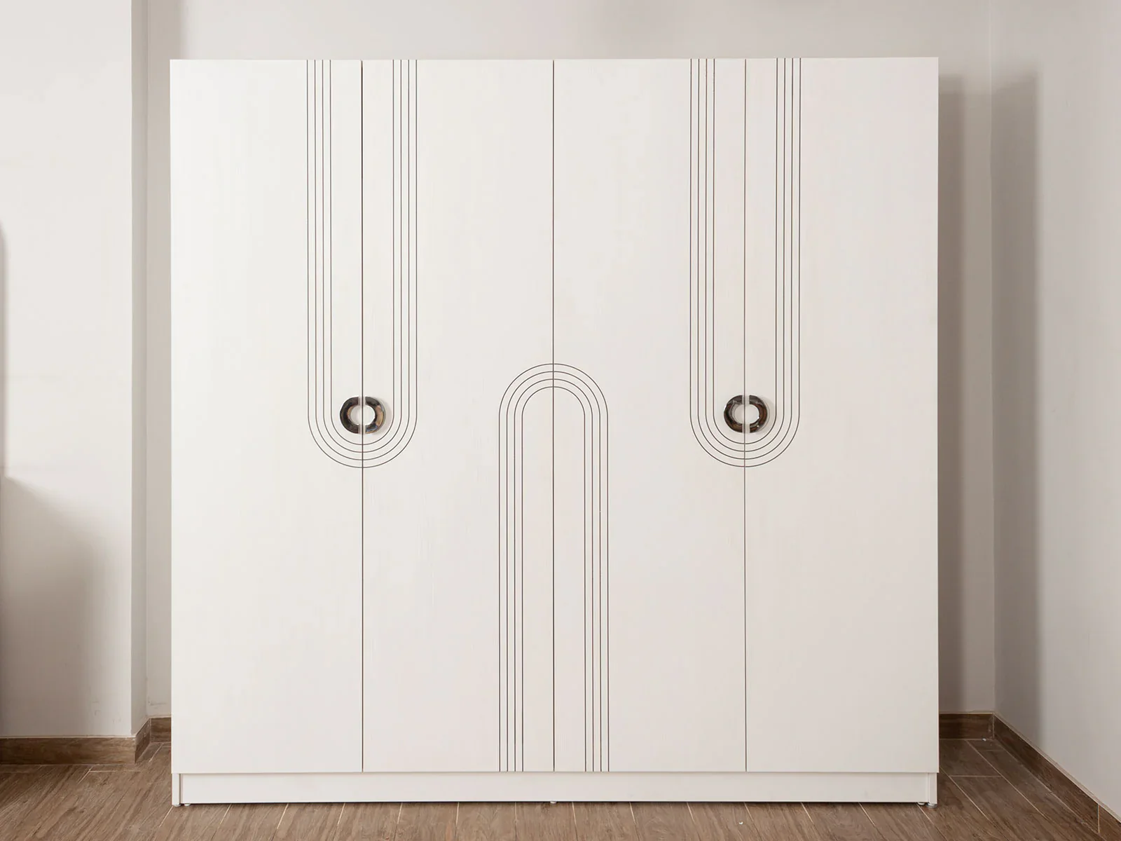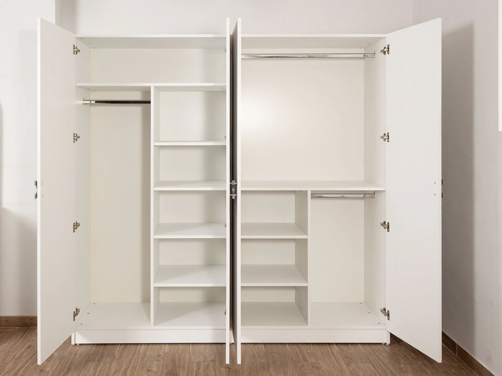 غرفة نوم متكاملة بتصميم عصري يجمع بين الراحة والتنظيم، مناسبة للاستخدام المنزلي أو الفندقي. تتكون من سرير مزدوج، دولاب واسع بأربعة أبواب مفصلية، تسريحة عملية، وكمود جانبي، مع أبعاد مدروسة لتوفير أقصى استفادة من المساحة.