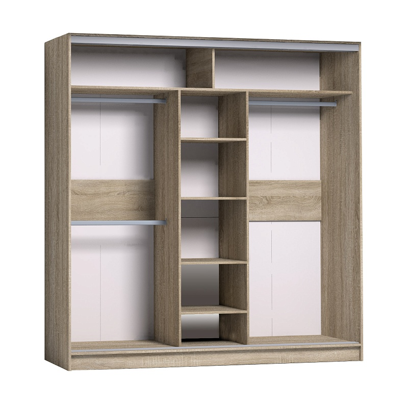 دولاب عصري بثلاث ضلف بأبواب جرّار، مصمّم لتوفير أقصى قدر من التنظيم الداخلي بدون التضحية بالمظهر الخارجي. يتميّز بتقسيمة عملية يناسب مختلف الأساليب العصرية.
