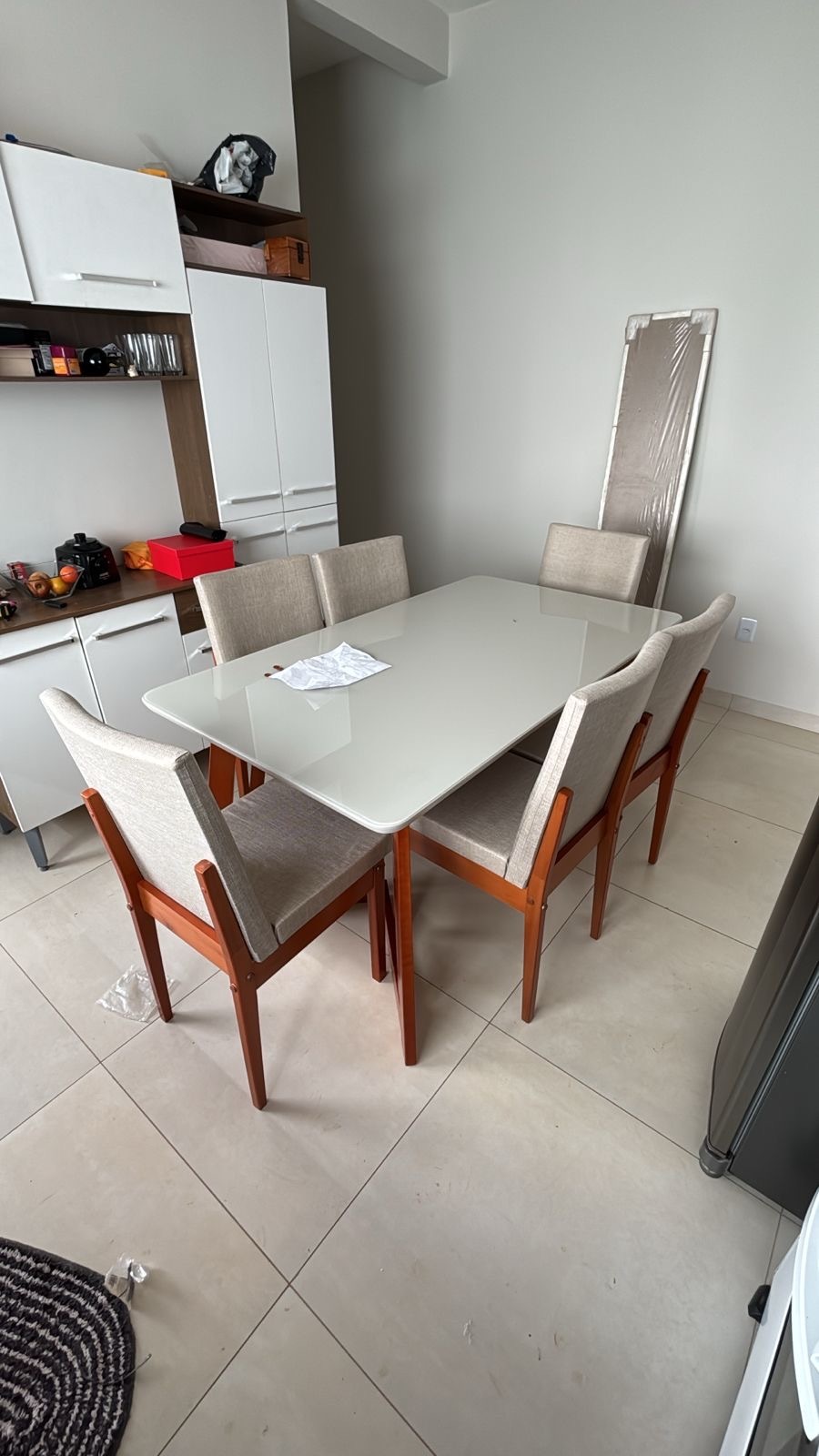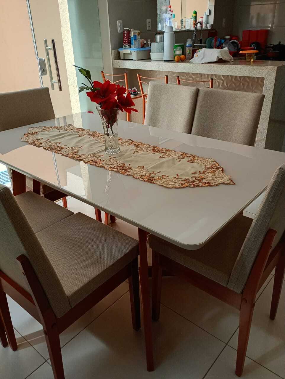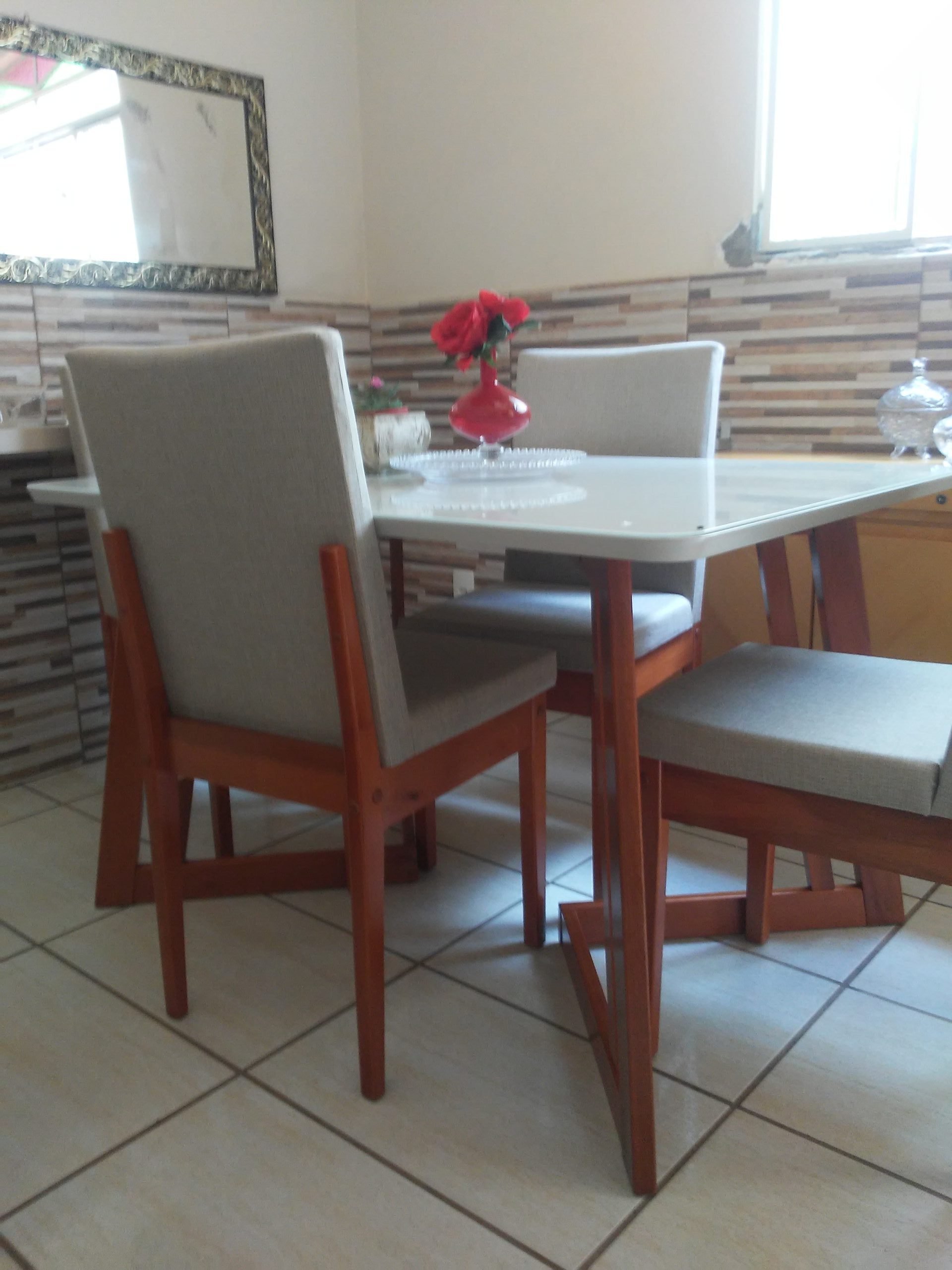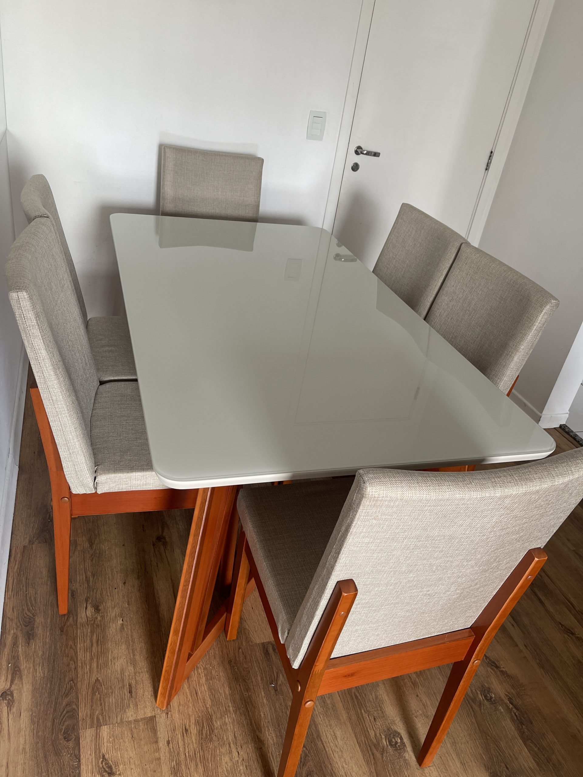 سفرة مودرن 6 كراسي – ترابيزة خشب كونتر طبيعي بسطح زجاجي 160×90×78 سم، وكراسي زان أحمر مبطنة بقماش ووتر بروف 44×54×100 سم – ضمان 10 سنوات.