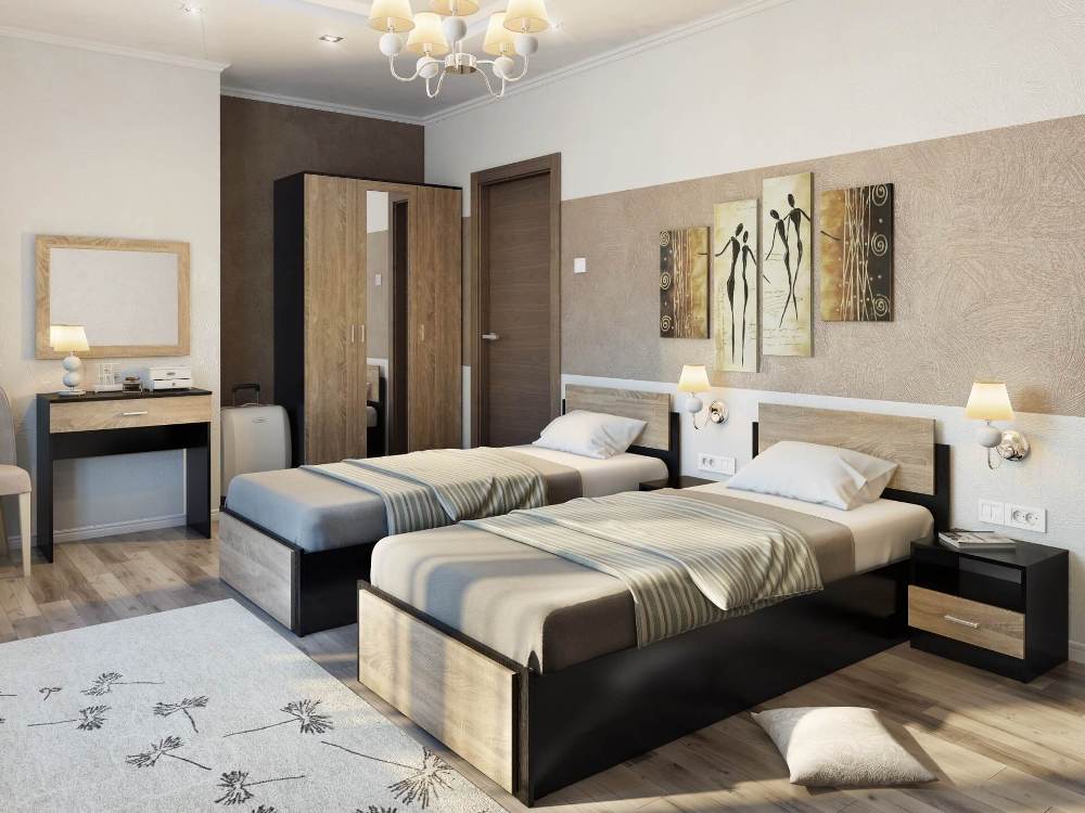 غرفة نوم متكاملة بتصميم عصري يجمع بين الراحة والتنظيم، مناسبة للغرف الفندقية أو الاستخدام المنزلي. تتكون من دولاب واسع، سريرين مفرد، كمود عملي، ومكتب جانبي، كل قطعة مصممة بأبعاد دقيقة لتوفير أقصى استفادة من المساحة.