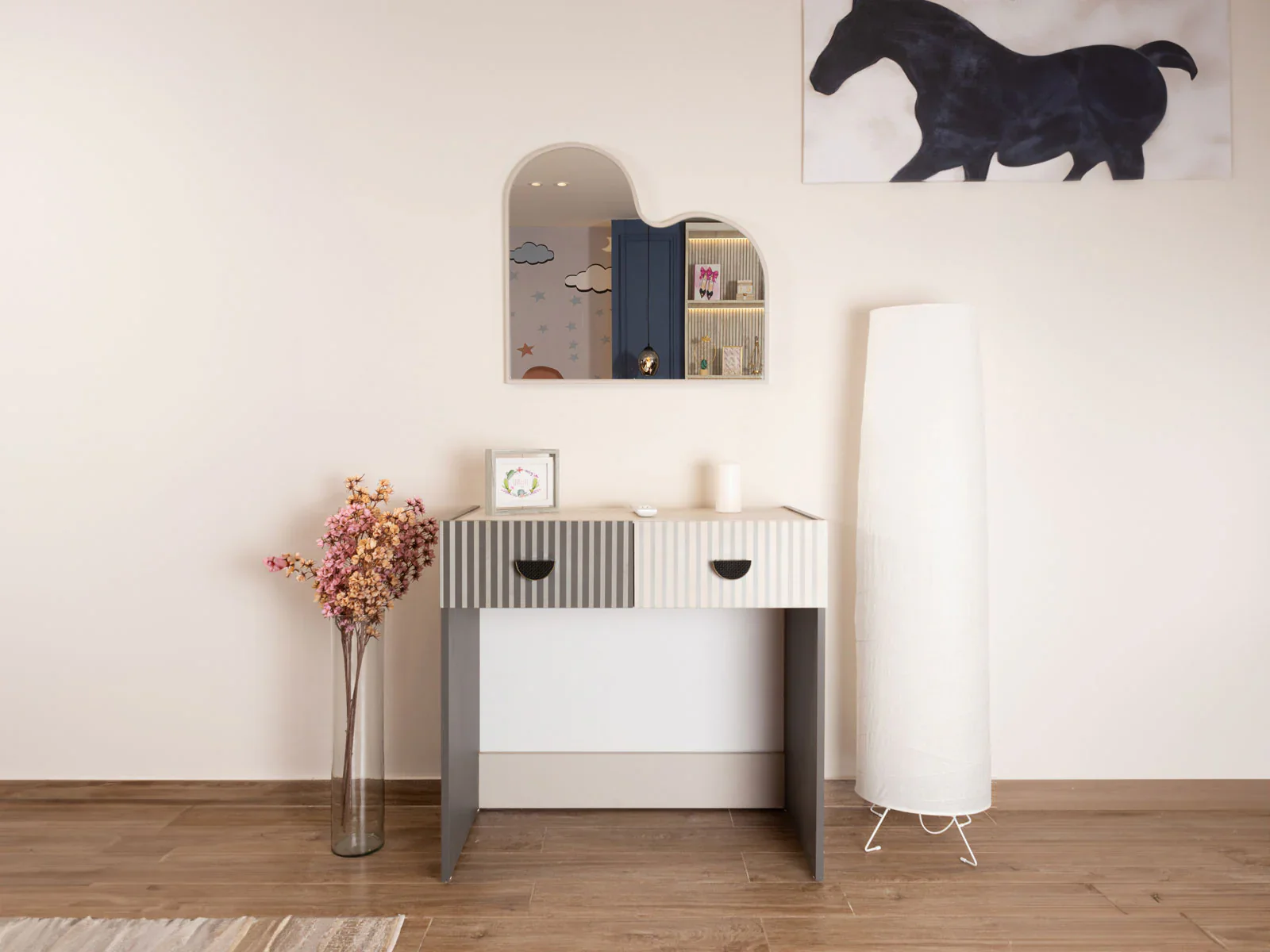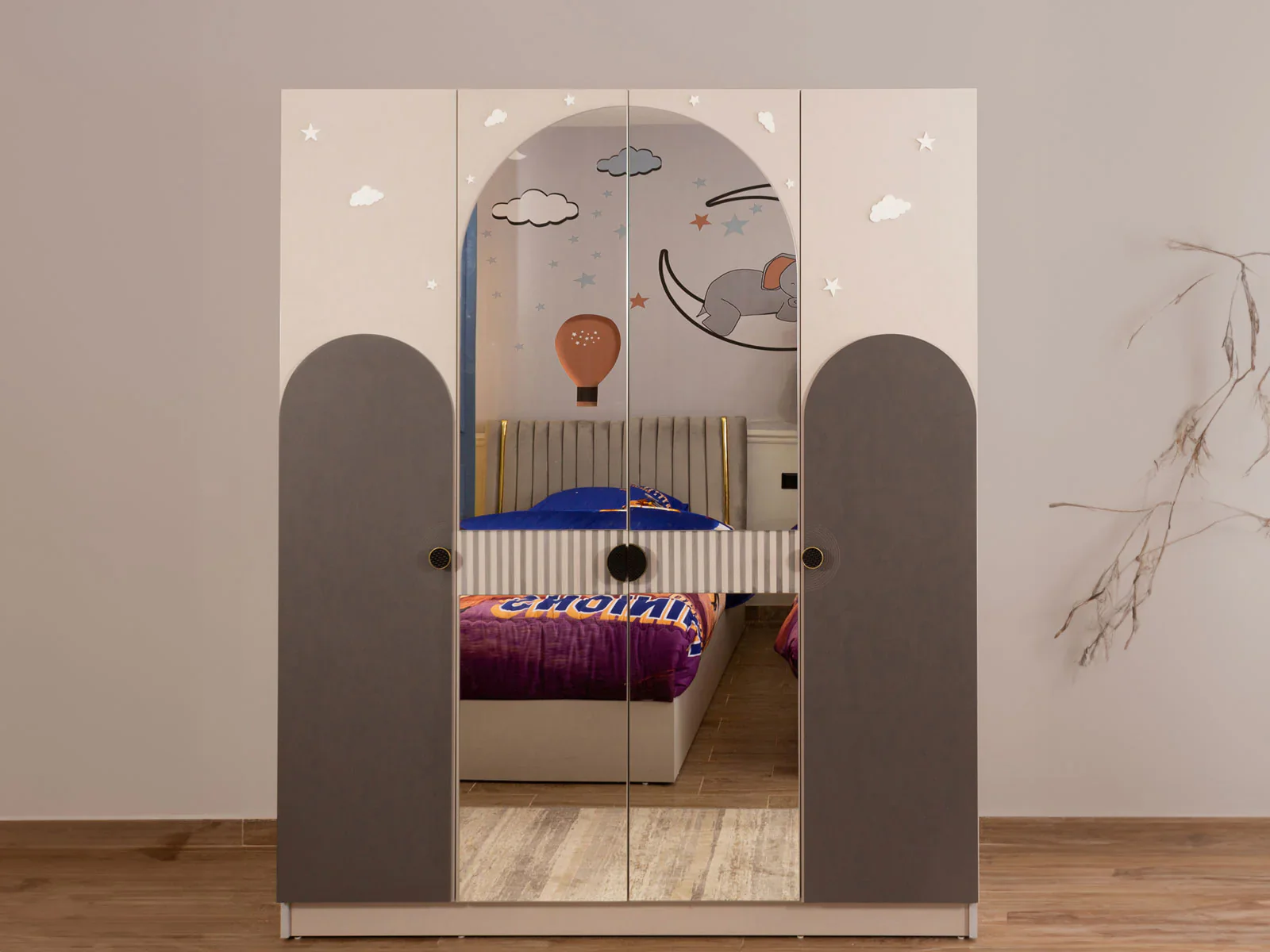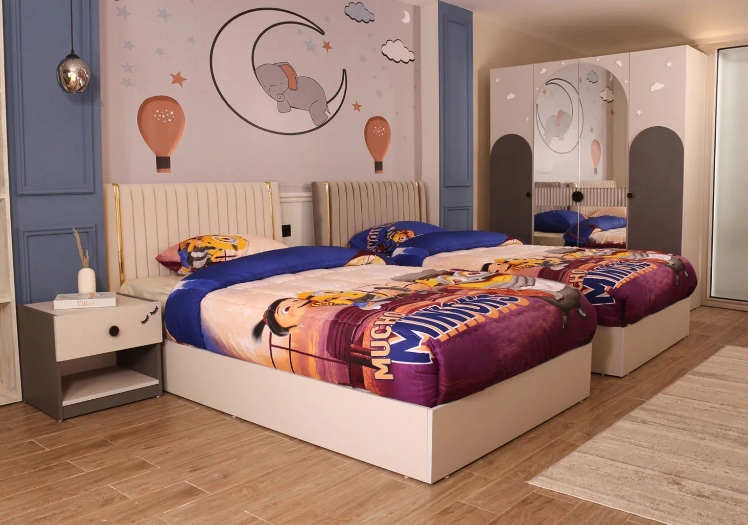غرفة نوم متكاملة – دولاب 4 أبواب مفصلية 160 سم، 2 سرير 120 سم، تسريحة بمرايا 85 سم، كمود 46 سم، تصميم عملي وخامات عالية الجودة، بضمان 10 سنوات.