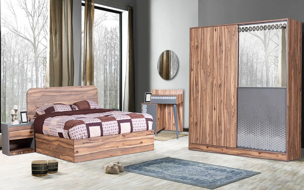 الوصف التفصيلي: غرفة نوم متكاملة بتصميم عصري أنيق باللون الخشبي البني، تجمع بين الراحة والتنظيم، مناسبة للاستخدام المنزلي أو الفندقي. تتكون من دولاب واسع، سرير مزدوج، تسريحة بمرايا، و2 كمود جانبي، مع أبعاد مدروسة لتوفير أقصى استفادة من المساحة.