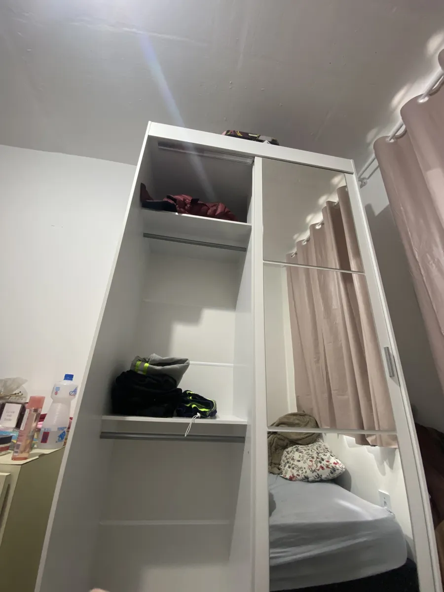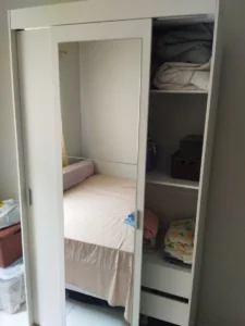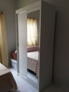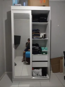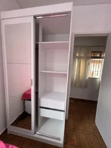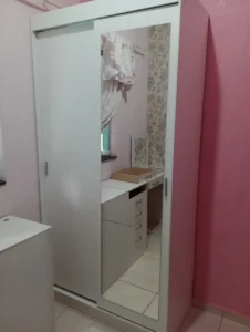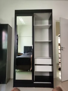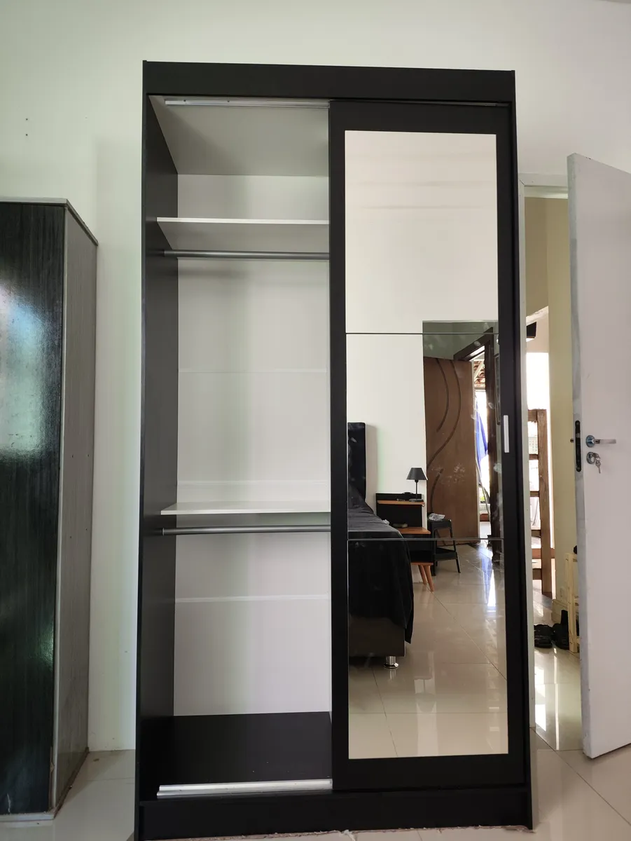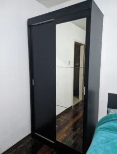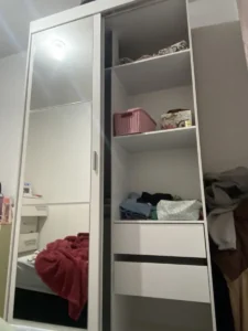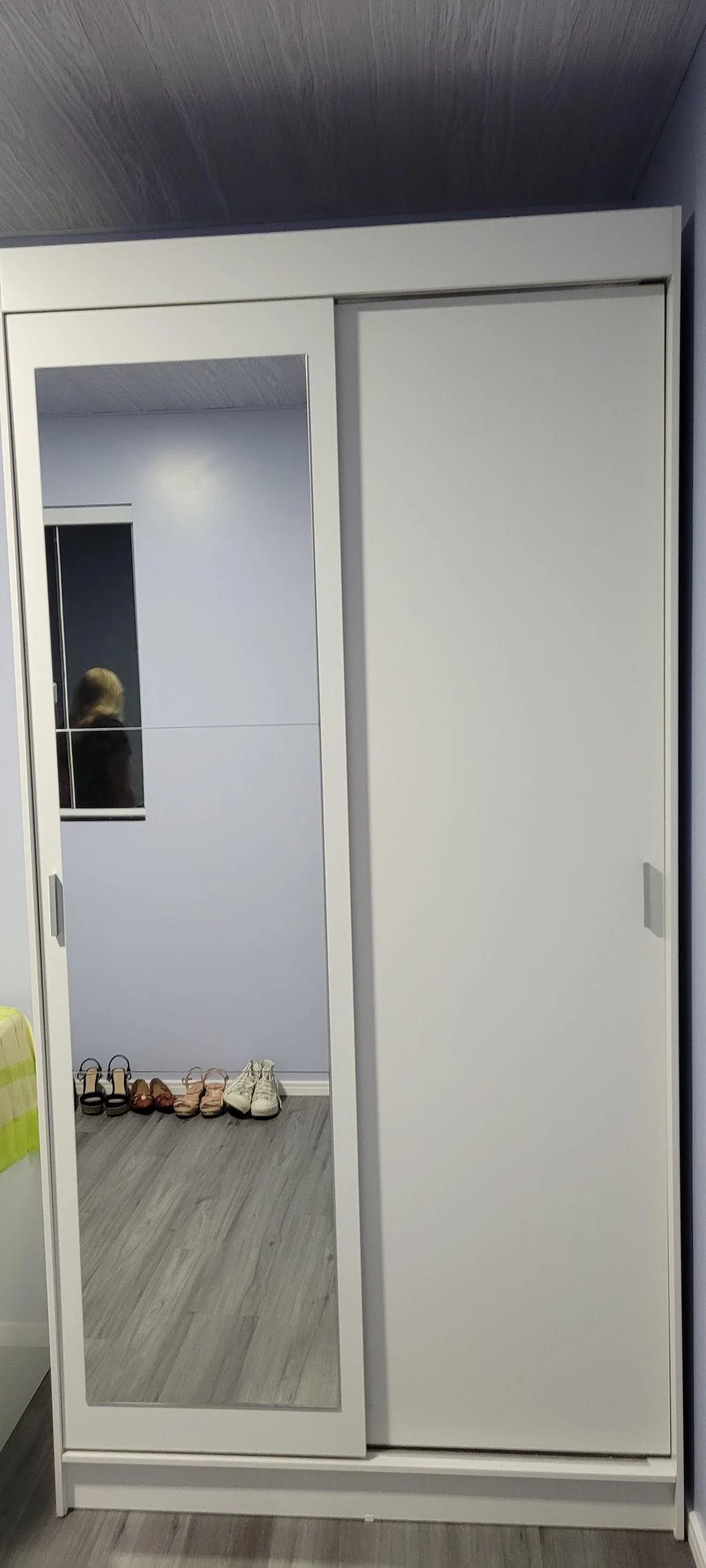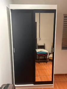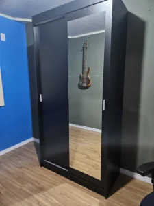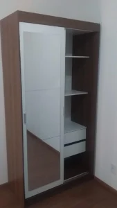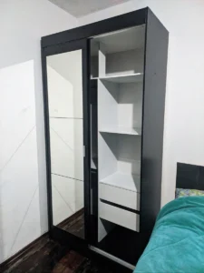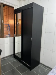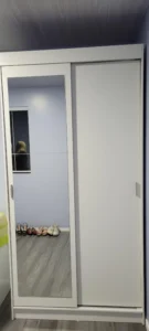 دولاب عرض متر، عمق 60 سم، ارتفاع 210 سم، أبواب جرار، باب واحد بمرايا، خشب كونتر طبيعي وقوايم زان، تقسيمة داخلية عملية، ضمان 10 سنوات.